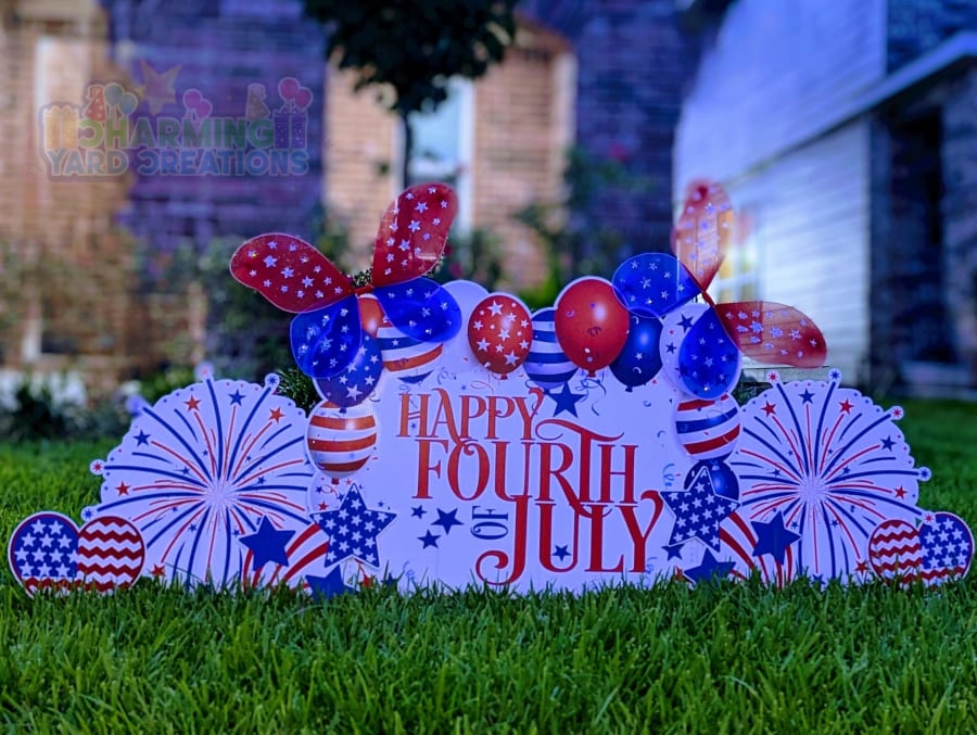 Happy 4th of July Yard Card Greeting comes with stars, balloons, gift box, hearts ETC. Greetings are also 20 characters.