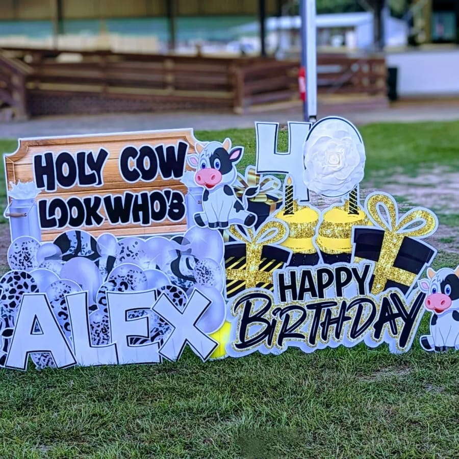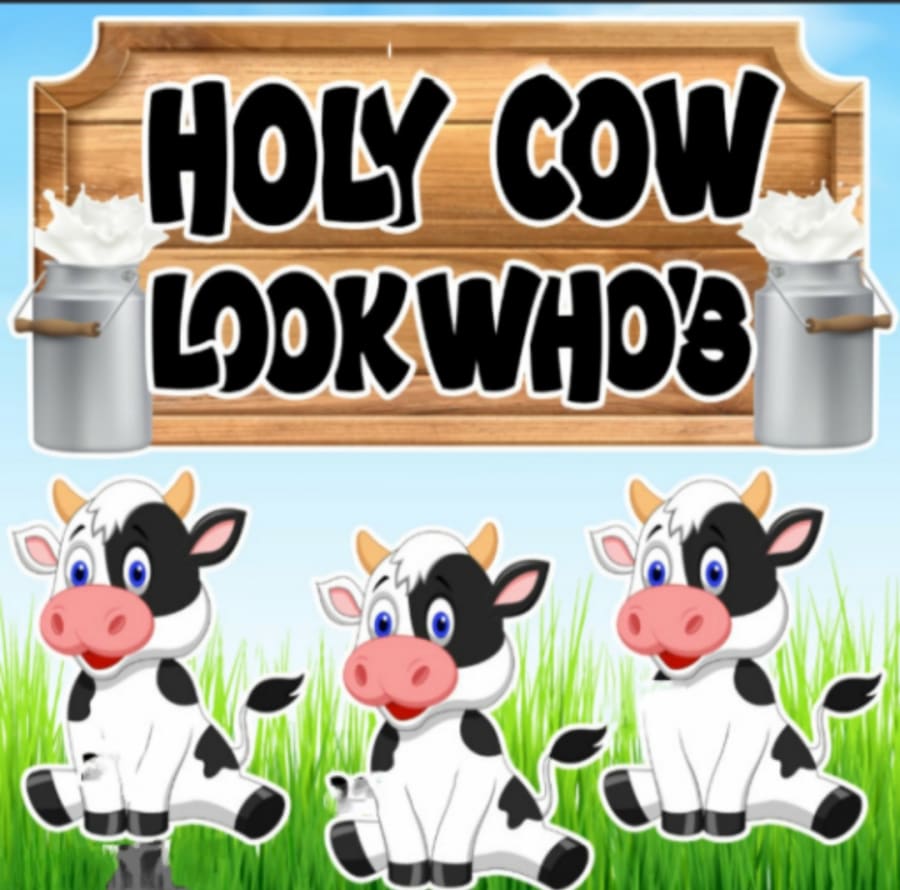 Holy Cow! Look Who yard card greeting comes with stars, balloons, gift box, hearts ETC. Greetings are also 20 characters.