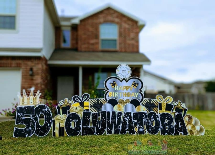 Black Gold Silver Happy Birthday greeting comes with name, age we will add stars, balloons, gift box, hearts ETC.