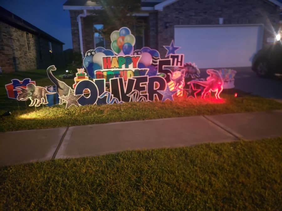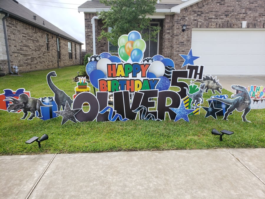 Dinos comes with greeting of your choice. We will add stars, balloons, gift box, hearts ETC. Greetings are also 25 characters.